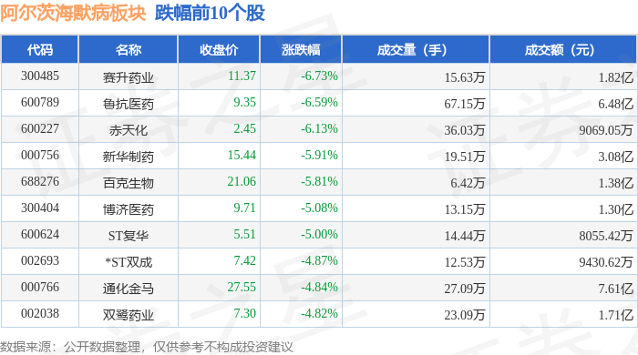 证券之星消息,11月21日阿尔茨海默病板块较上一交易日下跌3.2%,赛升药业领跌。当日上证指数报收于3834.89,下跌2.45%。深证成指报收于12538.07,下跌3.41%。阿尔茨海默病板块个股涨跌见下表: