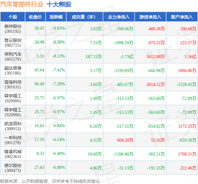 个股表现方面,汽车零部件行业当日领跌股为泰祥股份(301192),该股当日报收30.47,下跌9.83%,成交量3.03万,主力资金净流出700.06万元。登云股份(002715)以下跌8.38%紧随其后,该股当日成交量7.31万,主力资金净流出1098.59万元。除此之外,英利汽车(601279)、超达装备(301186)、壹连科技(301631)均进入当日熊股之列。具体个股列表见下表: