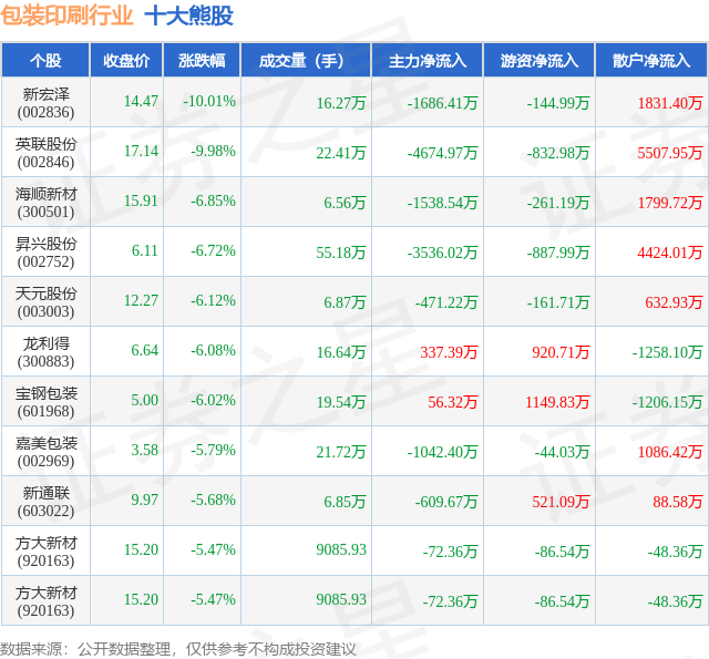 个股表现方面,包装印刷行业当日领跌股为新宏泽(002836),该股当日报收14.47,下跌10.01%,成交量16.27万,主力资金净流出1686.41万元。英联股份(002846)以下跌9.98%紧随其后,该股当日成交量22.41万,主力资金净流出4674.97万元。除此之外,海顺新材(300501)、昇兴股份(002752)、天元股份(003003)均进入当日熊股之列。具体个股列表见下表: