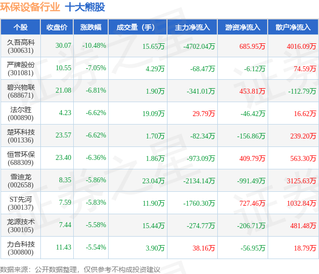 个股表现方面,环保设备行业当日领跌股为久吾高科(300631),该股当日报收30.07,下跌10.48%,成交量15.65万,主力资金净流出4702.04万元。严牌股份(301081)以下跌7.05%紧随其后,该股当日成交量4.29万,主力资金净流出68.47万元。除此之外,碧兴物联(688671)、法尔胜(000890)、楚环科技(001336)均进入当日熊股之列。具体个股列表见下表: