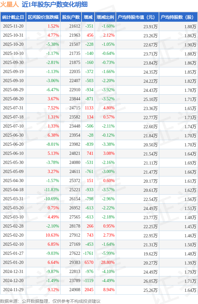证券之星消息,近日火星人披露,截至2025年11月20日公司股东户数为2.16万户,较10月31日减少351.0户,减幅为1.6%。户均持股数量由上期的1.86万股增加至1.88万股,户均持股市值为23.91万元。