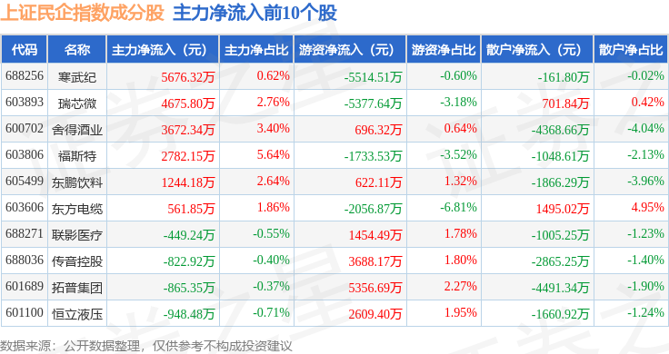 资金流向方面,上证民企(000049)指数成份股当日主力资金净流出合计80.25亿元,游资资金净流入合计18.28亿元,散户资金净流入合计61.97亿元。成份股资金流向详情见下表:
