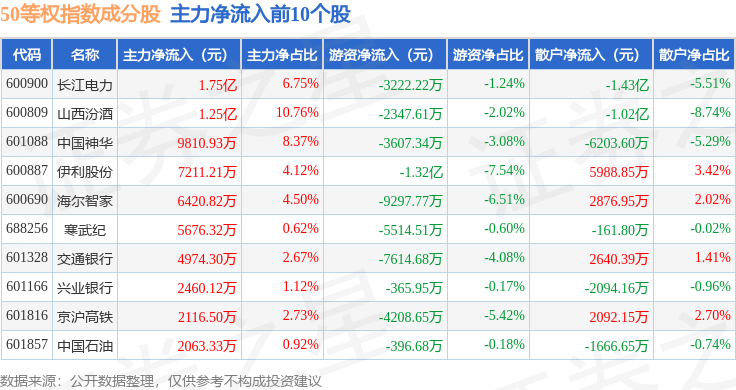 资金流向方面,50等权(000050)指数成份股当日主力资金净流出合计84.15亿元,游资资金净流入合计26.29亿元,散户资金净流入合计57.86亿元。成份股资金流向详情见下表: