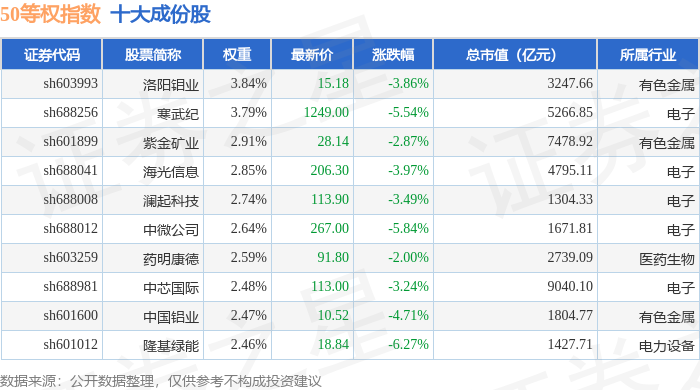 50等权(000050)指数十大成份股详情如下: