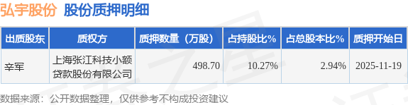 证券之星消息,弘宇股份(002890)11月21日公开信息显示,股东辛军向上海张江科技小额贷款股份有限公司合计质押498.7万股,占总股本2.94%。质押详情见下表: