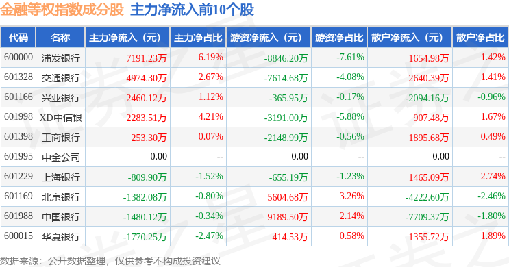 资金流向方面,金融等权(000076)指数成份股当日主力资金净流出合计37.63亿元,游资资金净流入合计12.42亿元,散户资金净流入合计25.21亿元。成份股资金流向详情见下表: