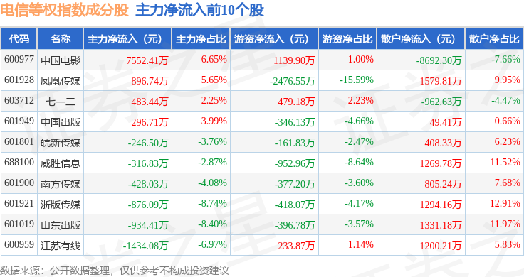 资金流向方面,电信等权(000078)指数成份股当日主力资金净流出合计16.14亿元,游资资金净流入合计4.93亿元,散户资金净流入合计11.21亿元。成份股资金流向详情见下表: