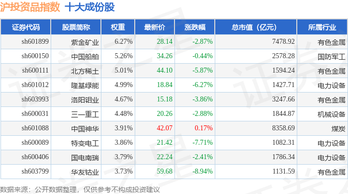 沪投资品(000102)指数十大成份股详情如下: