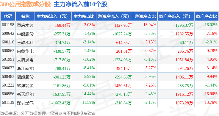 资金流向方面,380公用(000113)指数成份股当日主力资金净流出合计6.55亿元,游资资金净流入合计1.33亿元,散户资金净流入合计5.22亿元。成份股资金流向详情见下表: