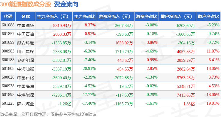 资金流向方面,300能源(000908)指数成份股当日主力资金净流出合计2.74亿元,游资资金净流出合计6563.41万元,散户资金净流入合计3.39亿元。成份股资金流向详情见下表: