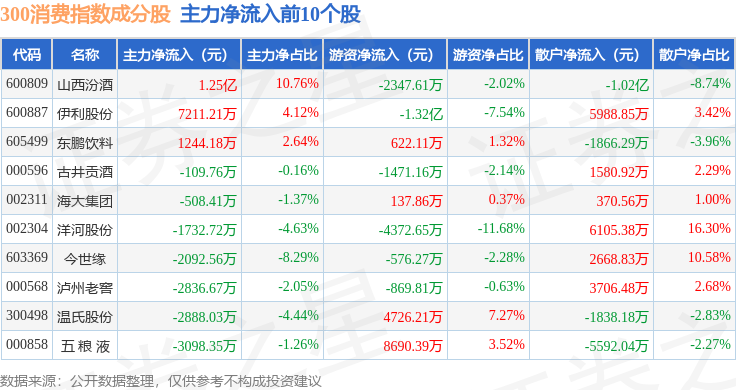 资金流向方面,300消费(000912)指数成份股当日主力资金净流出合计6.2亿元,游资资金净流入合计3.3亿元,散户资金净流入合计2.9亿元。成份股资金流向详情见下表: