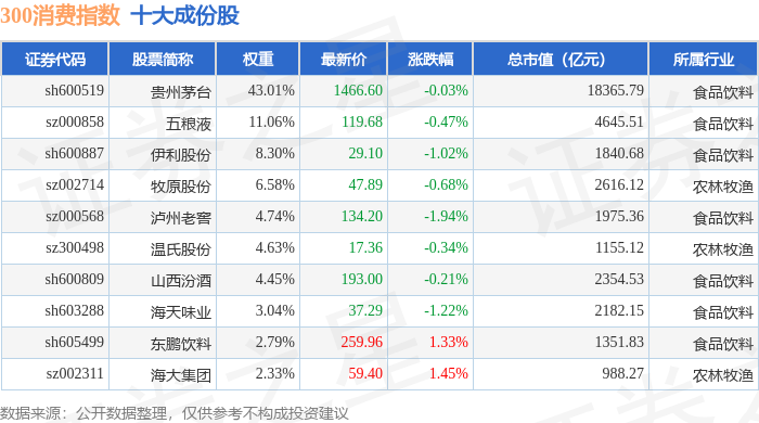 证券之星消息,11月21日,300消费(000912)指数报收于22018.32点,跌0.39%,成交193.35亿元,换手率0.65%。当日该指数成份股中,上涨的有3家,古井贡酒以1.88%的涨幅领涨,下跌的有14家,新希望以3.01%的跌幅领跌。