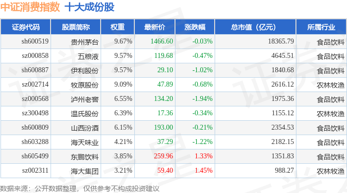 中证消费(000932)指数十大成份股详情如下: