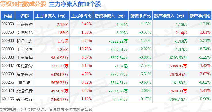 资金流向方面,等权90(000971)指数成份股当日主力资金净流出合计220.05亿元,游资资金净流入合计73.94亿元,散户资金净流入合计146.11亿元。成份股资金流向详情见下表:
