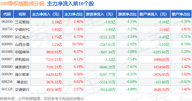 资金流向方面,300等权(000984)指数成份股当日主力资金净流出合计431.09亿元,游资资金净流入合计121.45亿元,散户资金净流入合计309.63亿元。成份股资金流向详情见下表: