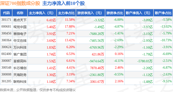 资金流向方面,深证700(399010)指数成份股当日主力资金净流出合计221.52亿元,游资资金净流入合计29.28亿元,散户资金净流入合计192.24亿元。成份股资金流向详情见下表: