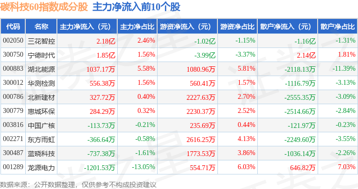 资金流向方面,碳科技60(399060)指数成份股当日主力资金净流出合计114.86亿元,游资资金净流入合计17.57亿元,散户资金净流入合计97.29亿元。成份股资金流向详情见下表: