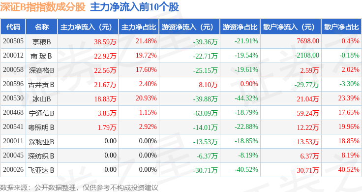 资金流向方面,深证B指(399108)指数成份股当日主力资金净流出合计1584.82万元,游资资金净流出合计28.47万元,散户资金净流入合计1613.29万元。成份股资金流向详情见下表: