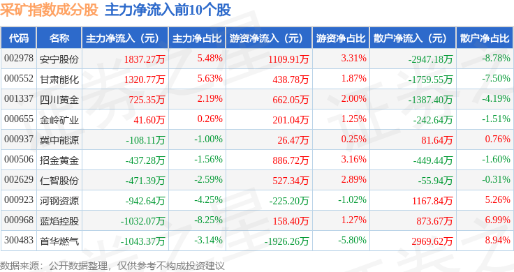 资金流向方面,采矿指数(399232)成份股当日主力资金净流出合计9.22亿元,游资资金净流入合计1.99亿元,散户资金净流入合计7.23亿元。成份股资金流向详情见下表: