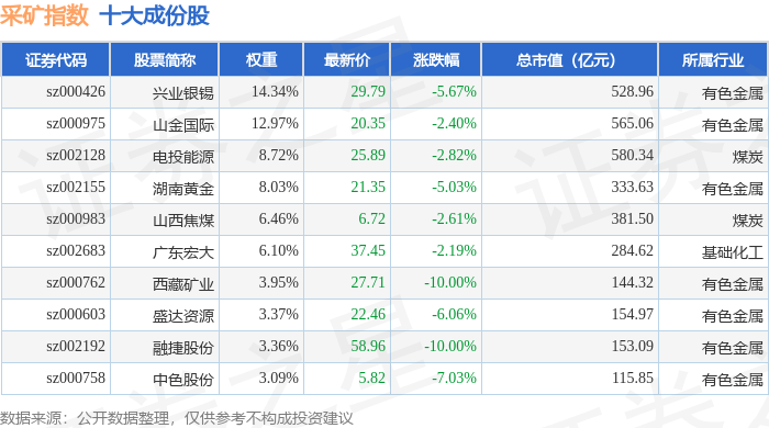 采矿指数(399232)十大成份股详情如下: