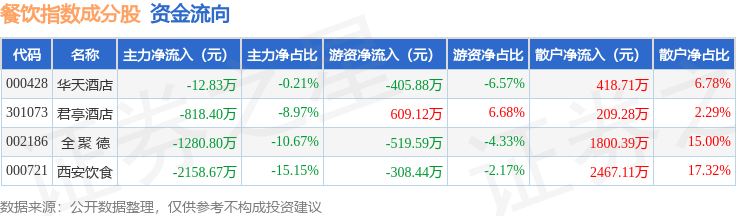 资金流向方面,餐饮指数(399238)成份股当日主力资金净流出合计4270.7万元,游资资金净流出合计624.8万元,散户资金净流入合计4895.5万元。成份股资金流向详情见下表: