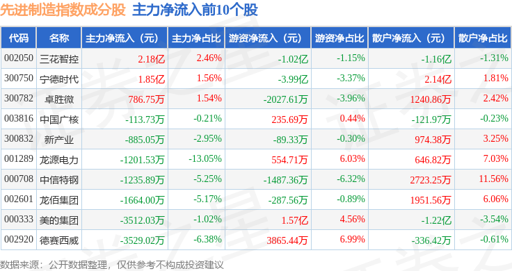 资金流向方面,先进制造(399260)指数成份股当日主力资金净流出合计130.97亿元,游资资金净流入合计40.01亿元,散户资金净流入合计90.96亿元。成份股资金流向详情见下表:
