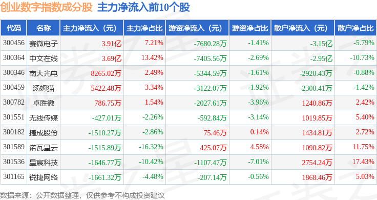资金流向方面,创业数字(399263)指数成份股当日主力资金净流出合计93.22亿元,游资资金净流入合计36.75亿元,散户资金净流入合计56.46亿元。成份股资金流向详情见下表: