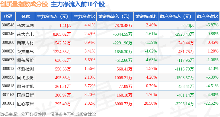 资金流向方面,创质量(399269)指数成份股当日主力资金净流出合计137.6亿元,游资资金净流入合计47.94亿元,散户资金净流入合计89.66亿元。成份股资金流向详情见下表: