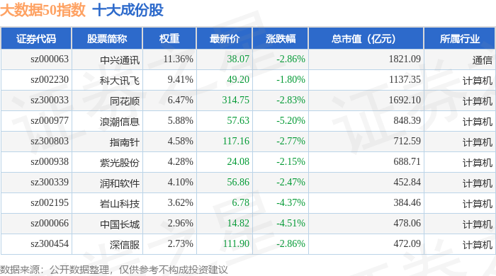 大数据50(399282)指数十大成份股详情如下: