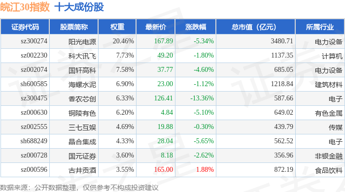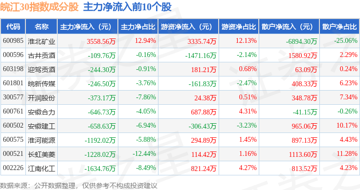 资金流向方面,皖江30(399350)指数成份股当日主力资金净流出合计41.42亿元,游资资金净流入合计14.44亿元,散户资金净流入合计26.98亿元。成份股资金流向详情见下表: