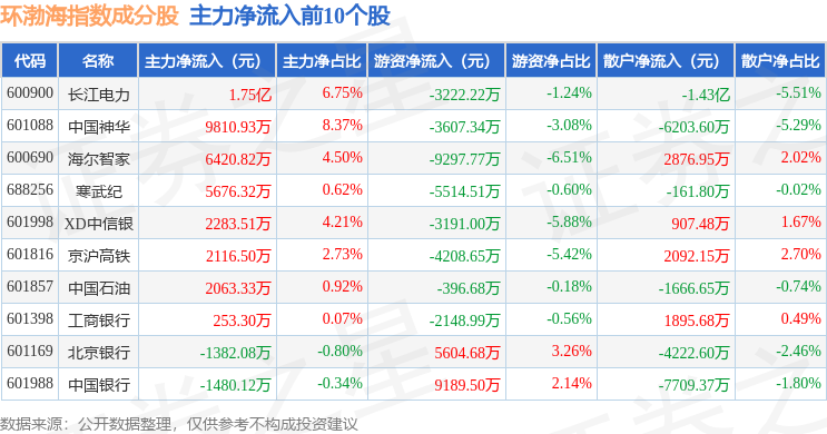 资金流向方面,环渤海(399357)指数成份股当日主力资金净流出合计40.37亿元,游资资金净流入合计23.42亿元,散户资金净流入合计16.95亿元。成份股资金流向详情见下表: