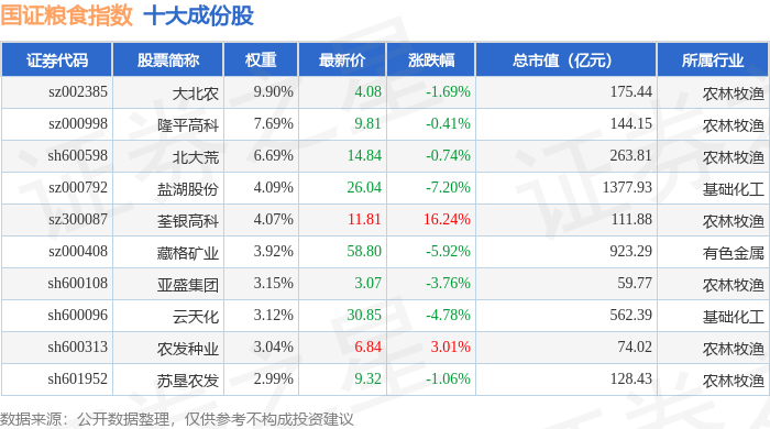 证券之星消息,11月21日,国证粮食(399365)指数报收于13203.95点,跌1.73%,成交328.16亿元,换手率3.82%。当日该指数成份股中,上涨的有4家,荃银高科以16.24%的涨幅领涨,下跌的有46家,和邦生物以7.79%的跌幅领跌。
