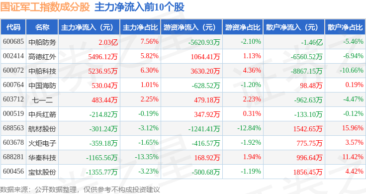 资金流向方面,国证军工(399368)指数成份股当日主力资金净流出合计21.69亿元,游资资金净流入合计5.44亿元,散户资金净流入合计16.25亿元。成份股资金流向详情见下表: