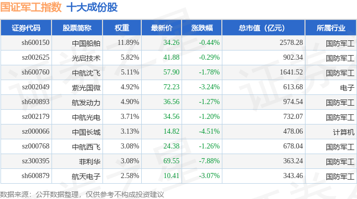 国证军工(399368)指数十大成份股详情如下:
