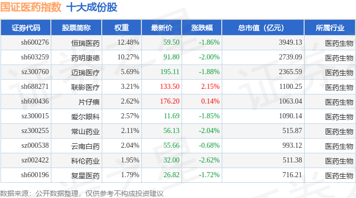 证券之星消息,11月21日,国证医药(399394)指数报收于8678.99点,跌1.8%,成交334.26亿元,换手率1.11%。当日该指数成份股中,上涨的有5家,联影医疗以2.15%的涨幅领涨,下跌的有75家,吉林敖东以5.54%的跌幅领跌。