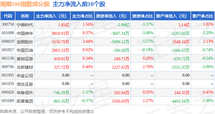 资金流向方面,周期100(399402)指数成份股当日主力资金净流出合计192.47亿元,游资资金净流入合计45.09亿元,散户资金净流入合计147.38亿元。成份股资金流向详情见下表: