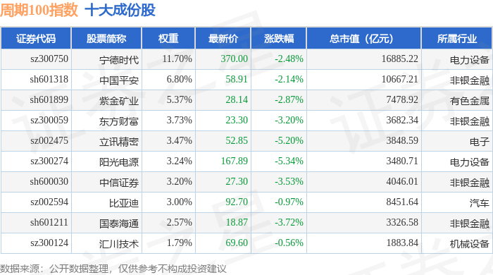 证券之星消息,11月21日,周期100(399402)指数报收于3580.5点,跌3.09%,成交1776.79亿元,换手率0.84%。当日该指数成份股中,上涨的有4家,恒立液压以2.69%的涨幅领涨,下跌的有93家,赣锋锂业以10.0%的跌幅领跌。