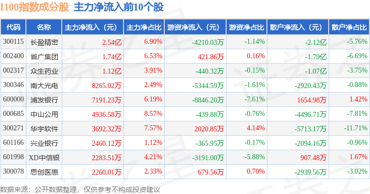 资金流向方面,I100(399415)指数成份股当日主力资金净流出合计59.09亿元,游资资金净流入合计11.84亿元,散户资金净流入合计47.25亿元。成份股资金流向详情见下表: