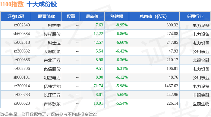 I100(399415)指数十大成份股详情如下: