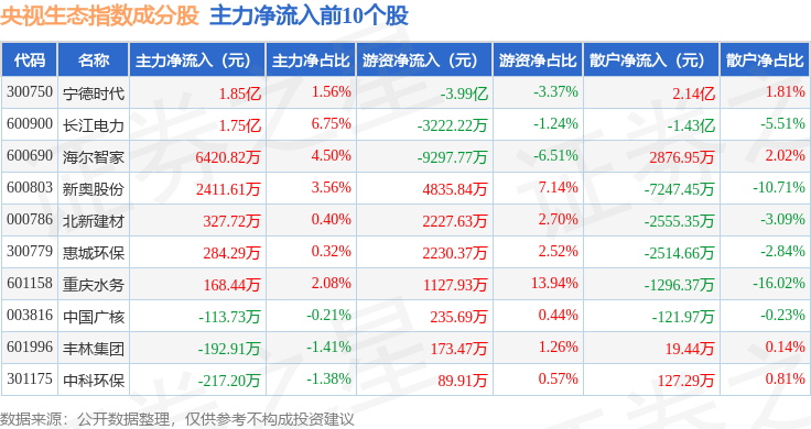 资金流向方面,央视生态(399556)指数成份股当日主力资金净流出合计74.11亿元,游资资金净流入合计18.26亿元,散户资金净流入合计55.85亿元。成份股资金流向详情见下表: