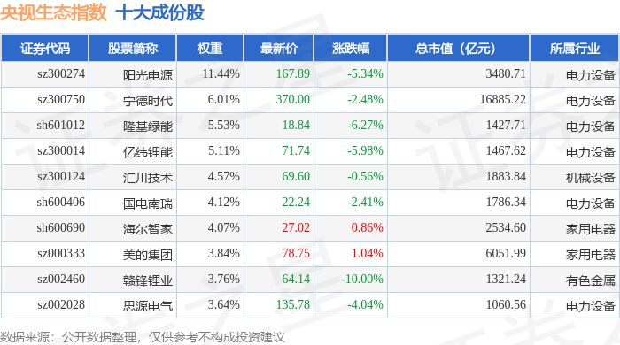 央视生态(399556)指数十大成份股详情如下: