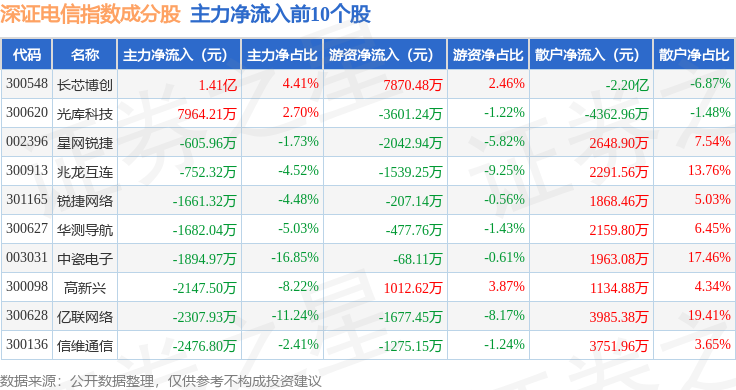 资金流向方面,深证电信(399621)指数成份股当日主力资金净流出合计48.39亿元,游资资金净流入合计25.38亿元,散户资金净流入合计23.0亿元。成份股资金流向详情见下表: