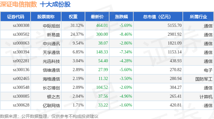 证券之星消息,11月21日,深证电信(399621)指数报收于9606.74点,跌5.53%,成交560.91亿元,换手率3.04%。当日该指数成份股中,上涨的有2家,光库科技以1.09%的涨幅领涨,下跌的有21家,新易盛以8.46%的跌幅领跌。
