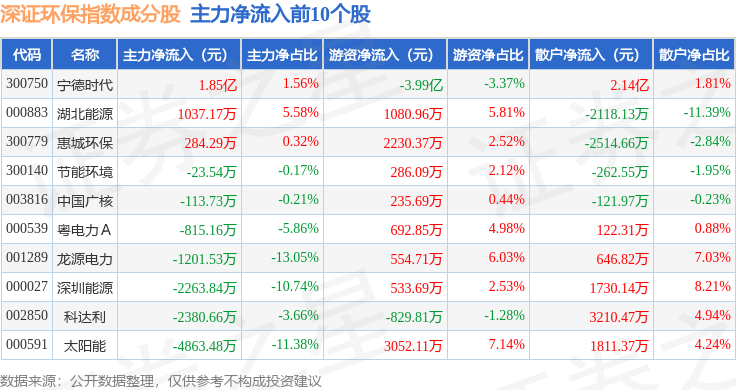 资金流向方面,深证环保(399638)指数成份股当日主力资金净流出合计97.94亿元,游资资金净流入合计16.39亿元,散户资金净流入合计81.55亿元。成份股资金流向详情见下表: