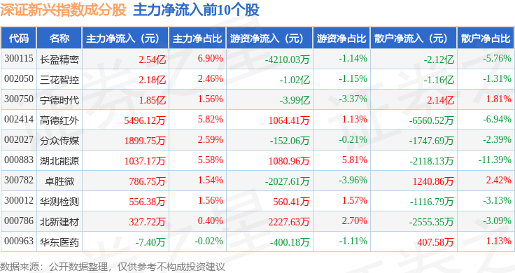 资金流向方面,深证新兴(399641)指数成份股当日主力资金净流出合计330.48亿元,游资资金净流入合计74.63亿元,散户资金净流入合计255.85亿元。成份股资金流向详情见下表: