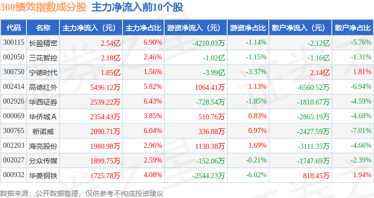 资金流向方面,300绩效(399657)指数成份股当日主力资金净流出合计372.98亿元,游资资金净流入合计87.14亿元,散户资金净流入合计285.84亿元。成份股资金流向详情见下表: