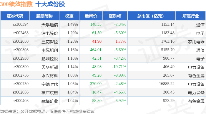 300绩效(399657)指数十大成份股详情如下: