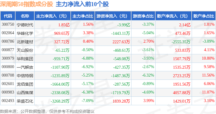 资金流向方面,深周期50(399670)指数成份股当日主力资金净流出合计134.08亿元,游资资金净流入合计28.99亿元,散户资金净流入合计105.09亿元。成份股资金流向详情见下表:
