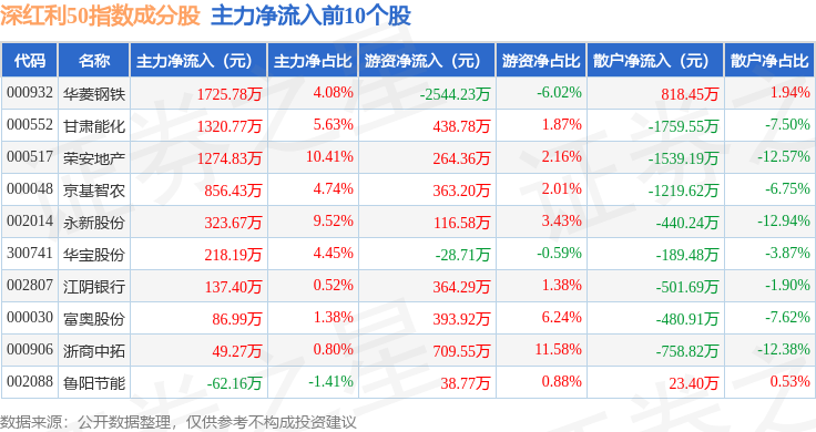 资金流向方面,深红利50(399672)指数成份股当日主力资金净流出合计8.24亿元,游资资金净流入合计1.48亿元,散户资金净流入合计6.75亿元。成份股资金流向详情见下表: