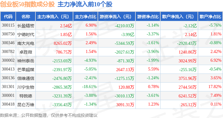资金流向方面,创业板50(399673)指数成份股当日主力资金净流出合计143.24亿元,游资资金净流入合计47.93亿元,散户资金净流入合计95.31亿元。成份股资金流向详情见下表: